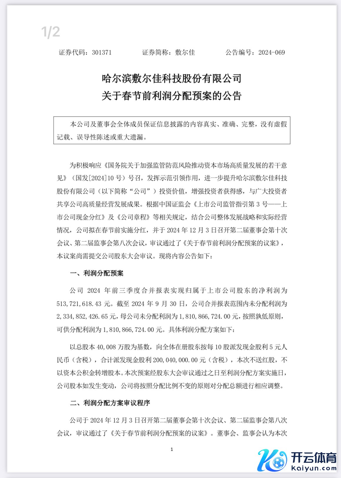 预案浮现,敷尔佳本年前三季度净利润约5.14亿元。落拓9月底,归并报表范围内未分派利润约23.35亿元。其中,母公司未分派利润约为18.11亿元,按该公司现存斟酌,具体分成预案为,拟每10股派发现款股利5元,总共派现款额约2亿元。