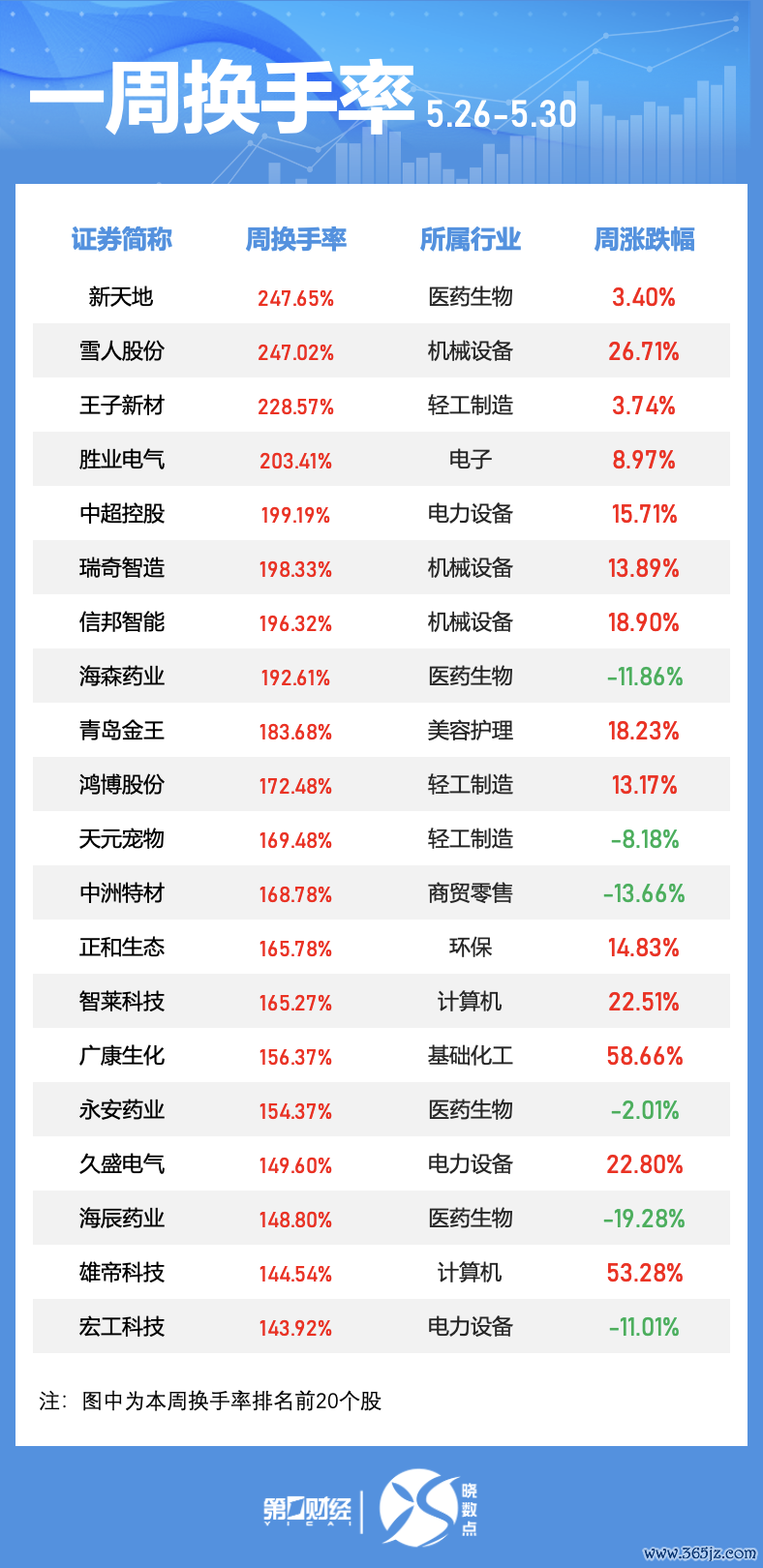 本周五个来回日中有82只个股换手率向上100%。其中,新世界名次居首,周换手率达到247.65%;此外,雪东说念主股份、王子新材、胜业电气3股本周换手率居前,均超200%。