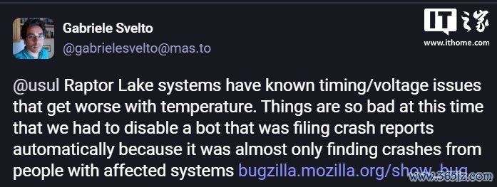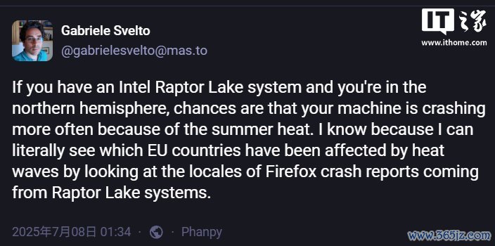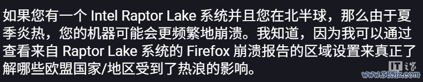 该工程师指出:“若是你用的是搭载了英特尔 Raptor Lake 架构 CPU 的电脑且处于北半球,那么在夏令时你的电脑可能更容易宕机。我是从火狐 Firefox 浏览器的崩溃论说中得知这一风物的,因为许多欧盟 / 好意思国地区的 Raptor Lake 电脑齐受到‘热浪’的影响”。
