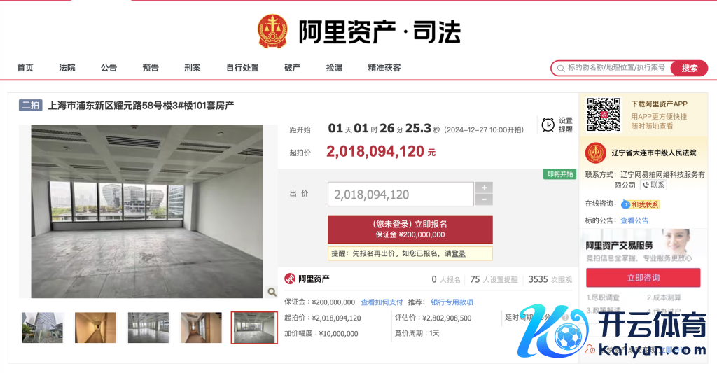 12月26日,倾盆新闻在阿里巴巴法则拍卖集会平台看到,上海市浦东新区耀元路58号楼3#楼101套房产,将于12月27日以20.18亿元进行第二次拍卖。钞票管理单元为辽宁省大连市中级东谈主民法院。