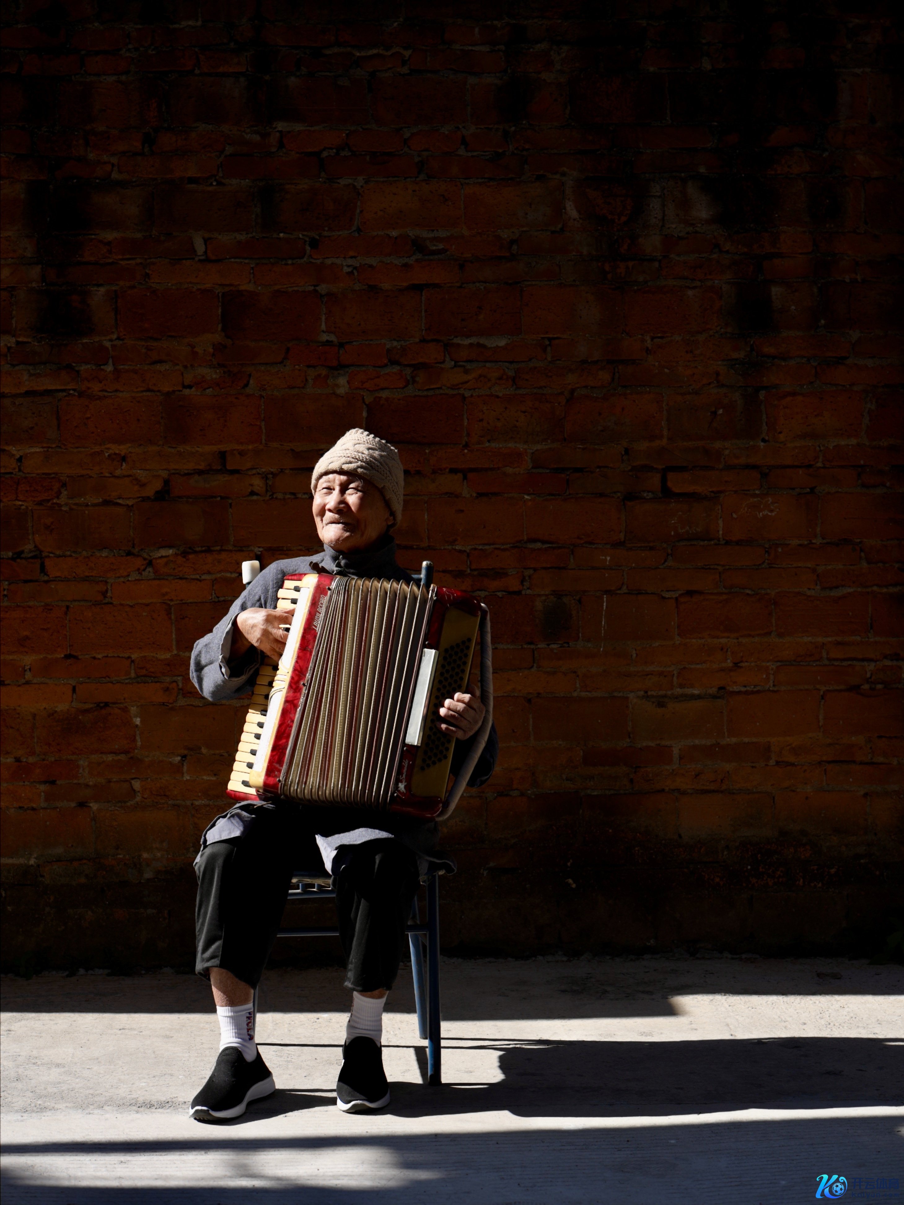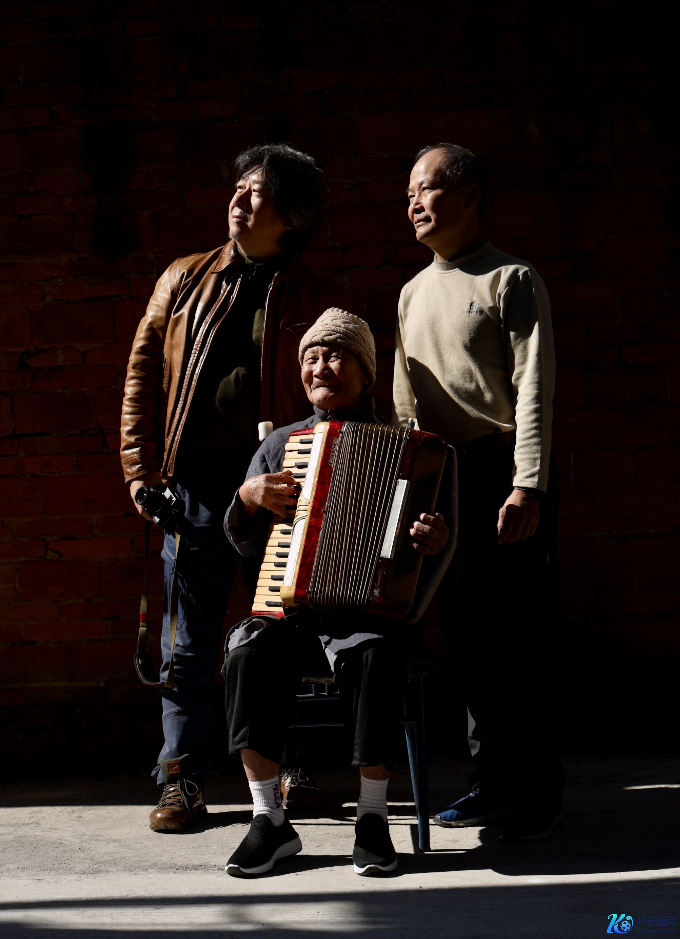 93岁的刘惠在家门口庭院,摆出《光影》中拉手风琴的姿势。