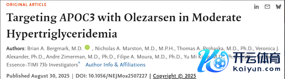 NEJM)最新发布的ESSENCE–TIMI 73b临床纯属效果标明 [1] ,新式反义寡核苷酸(ASO)药物olezarsen,针对伴有心血管风险的中度高甘油三酯血症患者,已毕了每月一次调理、甘油三酯降幅近60%的超卓疗效,为该类患者带来了全新的调理但愿。