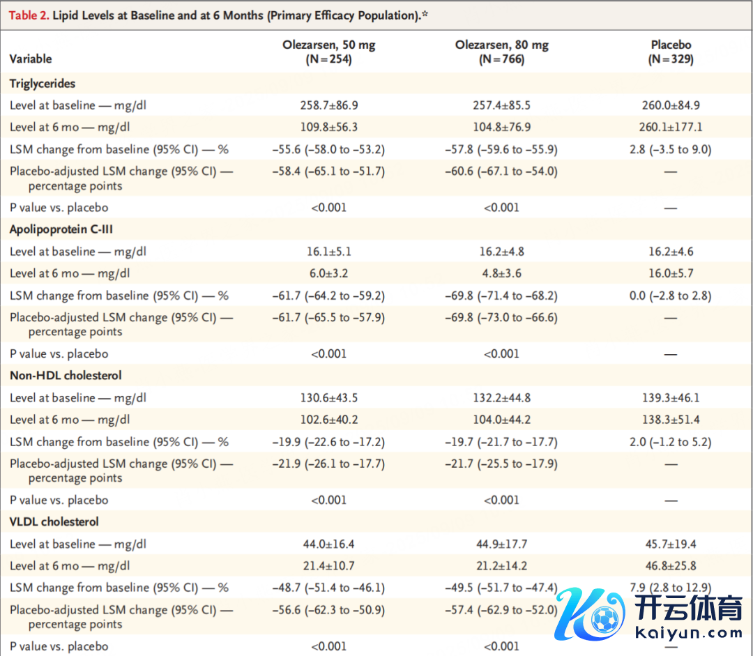 在细目及格受试者后,商议选择了两阶段赶紧分组揣摸打算:患者领先按1:3的比例分入50mg或80mg剂量组,随后在每个组内再以3:1的比例赶紧汲取每月一次的olezarsen或安危剂皮下打针。经过12个月捏续调理以及13周的安全随访,两组olezarsen剂量组均展现出显耀疗效: