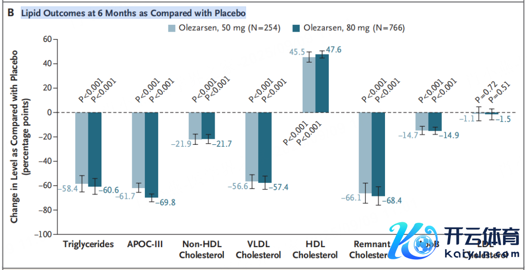 除甘油三酯外,残余胆固醇、非HDL-C、载脂卵白B等致动脉粥样硬化主义也显耀下落,而LDL-C水平未见彰着变化(图3)。
