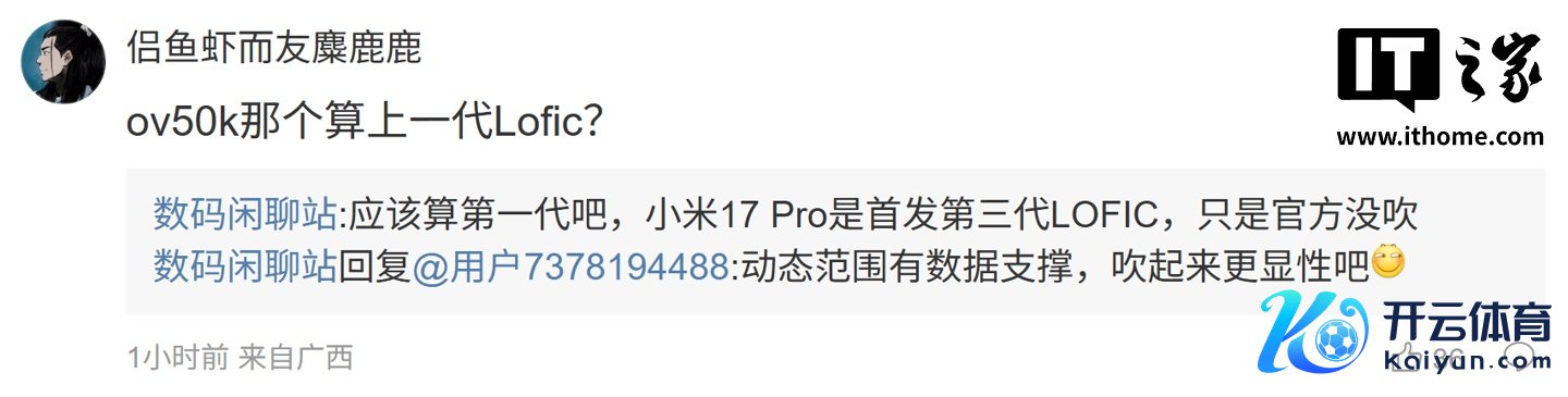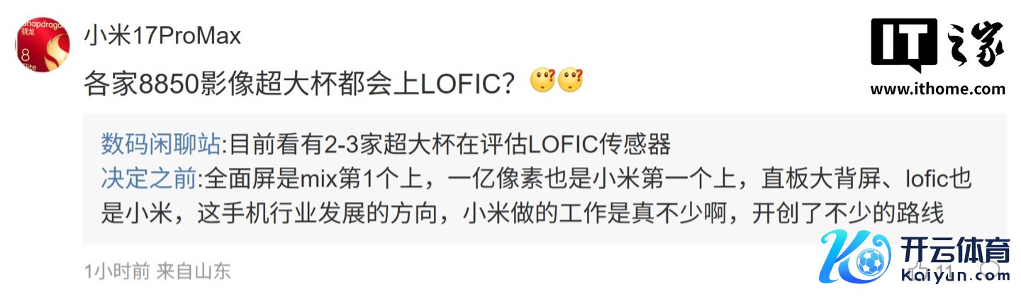 后续灵验户在指摘区究诘:“ov50k 哪个算上一代 Lofic?”,博主回应谈:“应该算第一代吧,小米 17 Pro 是首发第三代 LOFIC,仅仅官方没吹”;另别称用户则究诘谈:“各家 8850 影像超大杯皆会上 LOFIC?”,博主则回应谈:“现在看有 2-3 家超大杯在评估 LOFIC 传感器”。
