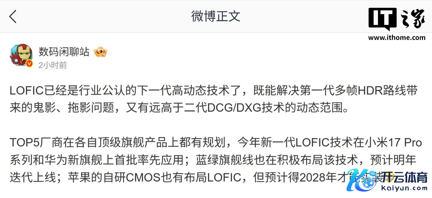 发布日期:2025-11-07 10:33 点击次数:165IT之家 10 月 10 日音书,博主 @数码闲扯站 今天在微博泄露,LOFIC 已成为行业公认的下一代高动态手艺。